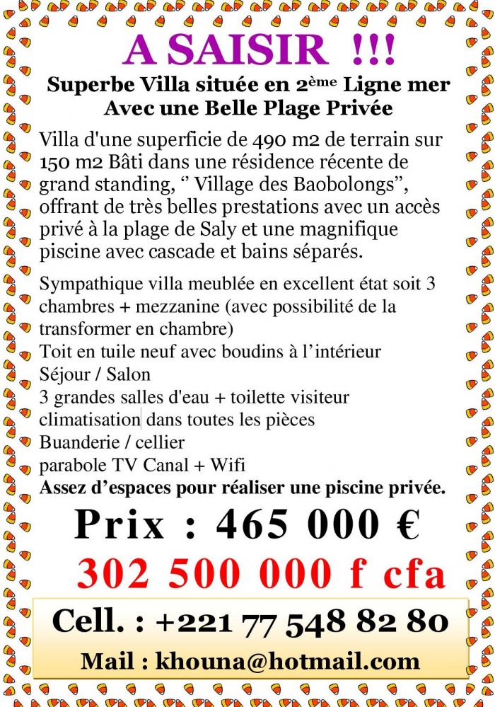Villa d'une superficie de 490 m2 de terrain sur 150 m2 Bâti dans une résidence récente de grand standing, ‘’ Village des Baobolongs’’, offrant de très belles prestations avec un accès privé à la plage de Saly et une magnifique piscine avec cascade et bains séparés.
