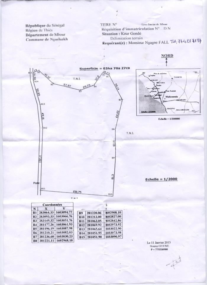 Thu 2 Aug à 17h59Réference : TNGK086 Environ 5 500 m2 du domaine national, constructible, Délimité par haie de salane, longé sur 82m par grande piste laterite reliant RN1 Dakar/Ngueko...
