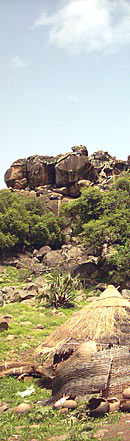 Photos ci-dessus : à gauche, le sommet de la colline de Bandafassi avec les premières cases d'Ethwar. A droite, la superbe porte sculptée d'une case à Ethwar. Ci-dessus : le panorama de la vallée pris depuis la colline de Bandafassi où l'on voit au loin les contreforts d'autres montagnes (photo C. Pinero).