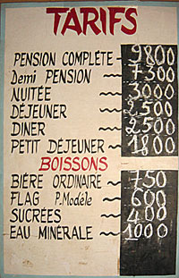 : à droite, la plaque des tarifs dans le campement