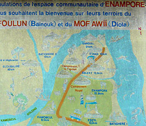 Photo : ci-contreà gauche, la pancarte du croisement Brin-Bandial avec la carte des campements villageois du Royaume de Bandial, sur les terroirs Foulun des Baïnouks et Mof Awii des Diolas.