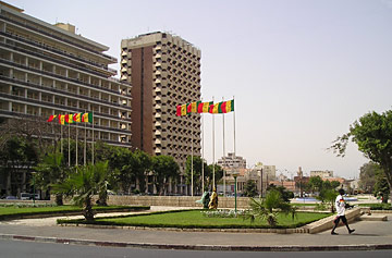 Dakar, la capitale sénégalaise est la ville de tous les contrastes. Le prix de son immobilier et ses difficultés de transports l'ont rendu invivable pour bon nombre de ses habitants sans cesse refoulés aux confins des banlieues dakaroises. Mais la vie n'est pas difficile pour tout le monde. Sans raison autre que le nombre d'immigrés sénégalais à l'étranger envoyant de l'argent au pays et l'afflux sans cesse croissant de fonctionnaires internationaux surpayés, la ville a connu en une vingtaine d'années une explosion immobilière rare en Afrique. Alors qu'il y a 15 ans, la moitié de la presqu'île du Cap Vert était recouverte par la brousse, il est difficile aujourd'hui de voir se balader un margouillat sur les murs. Heureusement, le climat de cette zone est agréable - voir frais - une bonne partie de l'année et les alizés qui balayent l'ensemble de la ville 12 mois sur 12 chassent la pollution grandissante que connait la cité. Photo ci-dessus: la place de l'Indépendance, en centre-ville