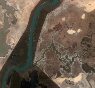 Photo à droite (visible sur la localisation) : à droite les canaux du Djoudj, en plein milieu on voit très nettement le cours normal du fleuve Sénégal et les digues qui ont été érigées tout au long.
