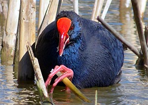 Photo à gauche : une poule sultane (Porphyrio porphyrio), une des 300 espèces d'oiseaux du sanctuaire du Djoudj