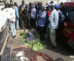 Photo à droite : Accident de la route à Dakar. La victime, piéton aplati sous les feuilles, a probablement été pris en sandwich entre le camion blanc et le minibus rouge.