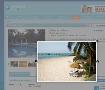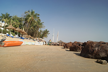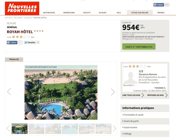 Photo à droite : capture d'écran du 25 avril 2014 du site de Nouvelles Frontières commercialisant le Royam à Saly avec une plage immaculée et ayant le mérite d'exister.... Photo qui doit dater d'il y a de nombreuses années.