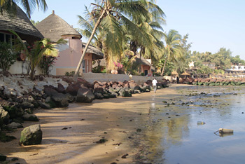 Photos ci-dessus : certains hôtels (ici l'Espadon) cimentent et enrochent à outrance sans empêcher la mer de ronger la côte à 1 mètre des premiers bungalows qui sont en sursis. La plage, absente à marée haute, n'est qu'une zone vaseuse et pleine de cailloux à marée basse.