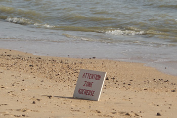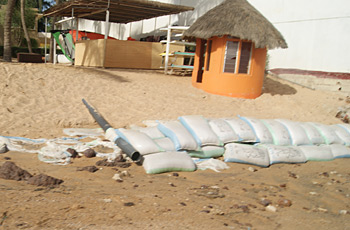 Photo à gauche : les vilains sacs de sable n'empêchent pas la cahute du gardien de plage de pencher façon tour de Pise. On notera au passage le très esthétique conduit d'évacuation dont on aimerait savoir ce qu'il évacue...