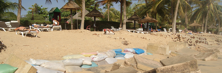 Or cette plage n'existe plus. Pire, pour prévenir la submersion pourtant inéluctable de la plupart des hôtels de Saly par une mer qui monte inexorablement, les hôteliers tentent, par les moyens les plus vains, de retenir les derniers grains de sable. Blocs de ciment qui font ressembler certaines parties du littoral salygoth aux plages de Normandie la veille du D-DAY, sacs de riz remplis de sable entretenus à grand renfort de manoeuvres sénégalais qui les remplissent chaque jour à la brouette pendant que les pauvres clients les regardent passer à 10cm de leur chaise longue, bétonnage à outrance mais bien inutile de centaines de mètres de côte ou empierrages qui rendent la baignade dangereuse voir impossible ::::: RIEN N'EST EPARGNE AU PIGEON QUI AURA ACHETE UN SEJOUR DANS CES HÔTELS.