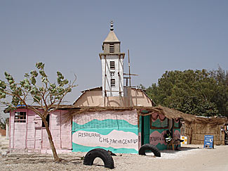 Photo à droite : un restau devant une mosquée au lac Rose