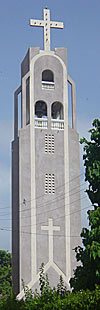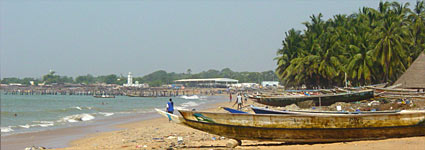 Photos : en haut à gauche, la plage principale de Mbour avec au fond en arrière-plan le marché aux poissons et à droite les cocotiers du Coco-Beach Hôtel. Ci-contre à droite, l'église de Mbour Sérère. De très nombreux Mbourois sont confession catholique.