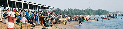 Photos : ci-dessus à droite, Mbour est une ville de commerce et de nombreuses boutiques animent les rues commerçantes. Ci-dessous le marché aux poissons de Mbour à l'arrivée des pirogues.