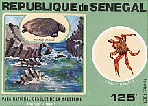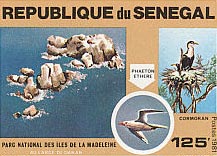 Photos : à droite, les îles de la Madeleine semblent avoir directement été importées des terres antarctiques, ci-dessous à gauche, un timbre sénégalais illustrant les îles du parc et leur symbole, le phaéton éthéré.