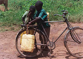 Photo à gauche : enfants chargeant des bidons d'alcool sur leur vélo en Casamance